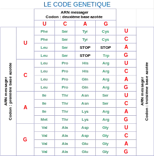 Acide aminé : FFLLSSSSYY**CCWWLLLLPPPPHHQQRRRRIIMMTTTTNNKKSS**VVVVAAAADDEEGGGG Initiation : ································MMMM···············M············ 1re base : UUUUUUUUUUUUUUUUCCCCCCCCCCCCCCCCAAAAAAAAAAAAAAAAGGGGGGGGGGGGGGGG 2e base : UUUUCCCCAAAAGGGGUUUUCCCCAAAAGGGGUUUUCCCCAAAAGGGGUUUUCCCCAAAAGGGG 3e base : UCAGUCAGUCAGUCAGUCAGUCAGUCAGUCAGUCAGUCAGUCAGUCAGUCAGUCAGUCAGUCAG
