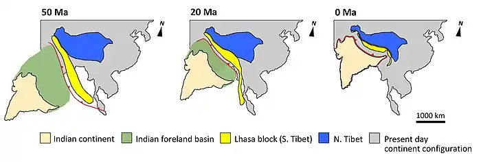 Au moment de la collision des continents indien et asiatique, le sud du Tibet avait déjà atteint 3 000 à 4 000 m d'altitude[27],[29],[31]. La force de compression découlant de la collision indo-asiatique a encore accru l'élévation du bloc de Lhassa et déclenché un épaississement de la croûte dans le nord du Tibet à mesure que le continent indien progressait vers le nord.