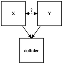 L'introduction dans le modèle d'informations sur le collisionneur (via un ajustement statistique, une stratification ou une sélection de l'échantillon basés sur les valeurs du collisionneur) ouvre un chemin entre X et Y et crée une association non causale entre ces deux variables (paradoxe de Berkson).