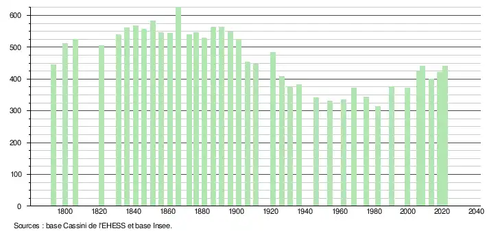 L'évolution du nombre d'habitants est connue à travers les recensements de la population effectués dans la commune depuis 1793. Pour les communes de moins de 10 000 habitants, une enquête de recensement portant sur toute la population est réalisée tous les cinq ans, les populations légales des années intermédiaires étant quant à elles estimées par interpolation ou extrapolation[25]. Pour la commune, le premier recensement exhaustif entrant dans le cadre du nouveau dispositif a été réalisé en 2008[26].