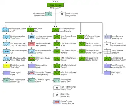 Pendant la guerre israélo-arabe de 1948, le commandement central est chargé des efforts de guerre contre la Jordanie, en particulier sur la route de Jérusalem, occupant le « Petit Triangle » (Sharon oriental), Lod et Ramla. Pendant la guerre des Six Jours, le commandement dirige l'occupation de la Cisjordanie depuis la Jordanie. Depuis la première intifada, le commandement s'engage principalement dans des activités de sécurité et de lutte contre le terrorisme, ainsi que dans des mesures militaires plus conventionnelles, en Cisjordanie[réf. nécessaire].