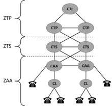 - le commutateur de transit secondaire (CTS) où on définit une communication interurbaine ou régionale. Il relie donc tous les CAA de la même zone de transit secondaire (ZTS) ou transfert les communications au CTP lorsque ce n’est plus de son ressort[2].