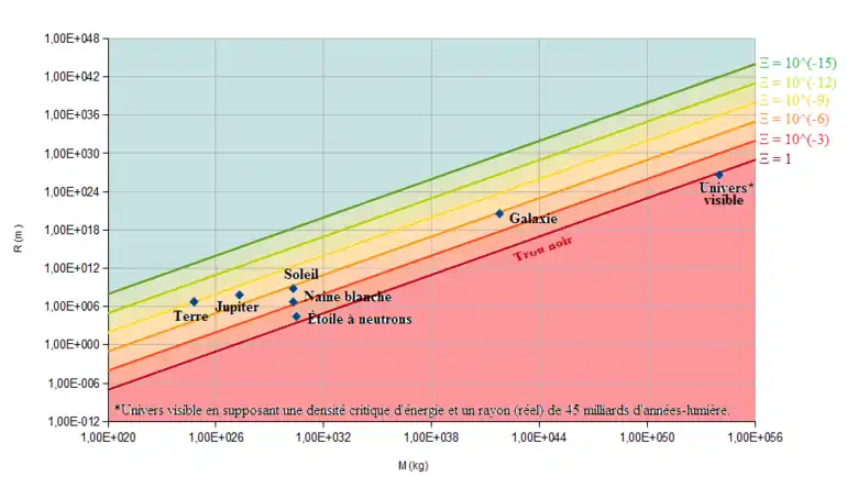 | Objet | Masse M | Rayon de Schwarzschild correspondant RS | Rayon réel R (m) | Masse volumique ρ (kg/m3) | Compacité Ξ | Remarques |