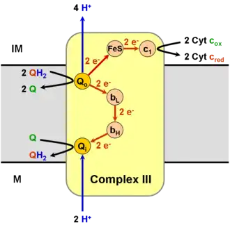 - Ceci a pour effet de libérer deux protons H+ et un ferrocytochrome c dans l'espace intermembranaire mitochondrial ainsi qu'une molécule d'ubiquinone dans la membrane mitochondriale interne, issue de l'oxydation de l'ubiquinol initialement lié au site Qo. Le radical semiquinone, quant à lui, demeure lié au site Qi.