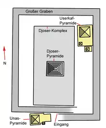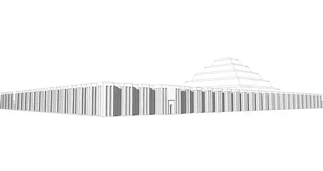 Le complexe funéraire de Djéser est le premier de cette importance et le plus grand jamais construit à notre connaissance en Égypte[5]. Il est composé, outre d'une pyramide à degrés, de nombreux édifices cultuels destinés aux cérémonies associées à la vie du souverain dans l'autre monde : un « temple T » (ou palais), un serdab, des chapelles de la fête-Sed, un temple funéraire, une tombe sud, deux pavillons (nord et sud), deux autels, deux bornes, des magasins et enfin une grande enceinte à redans clôturant cet ensemble de constructions qui s'étend sur plus de quinze hectares.