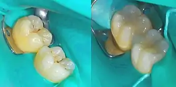 - Nécessite l'utilisation de la digue dentaire (le matériau ne tolère pas la contamination) et normalement d'un mordançage préalable