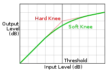 Le « soft knee » (transition douce) permet une entrée en action plus progressive du compresseur et paramétrable, le « coude » est arrondi. Les signaux un peu plus faibles que le seuil sont déjà légèrement réduits, ceux qui sont seulement un peu au-dessus du seuil sont moins affectés que ceux qui sont largement au-dessus. Le « hard knee » fait référence au comportement classique d'un compresseur.