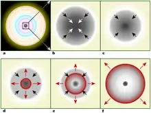 Aucune compression gravitationnelle supplémentaire n'intervient jusqu'au moment où l'hydrogène est presque complètement utilisé, réduisant ainsi la pression thermique de la réaction de fusion[3] et amenant, dans un premier temps, une nouvelle compression. L'augmentation de densité et de température de cette dernière, conjuguée à l'accumulation d'hélium, entraîne la fusion de l'hélium, ce qui augmente fortement la pression thermique et mène l'étoile au stade de géante rouge.