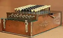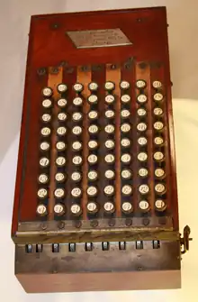 Le comptomètre reprend l'idée du clavier à touche de l'arithmomètre de Hill[3] breveté aux États-Unis en 1857. Le principe de l'addition reste aussi simple que celui de la Pascaline. Par contre, la soustraction est différente et procède par addition du complément à 9 qui est inscrit en minuscule sur chaque touche du clavier.