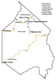 Le comté ne contient aucune ville incorporée mais plusieurs villages considérés par le Bureau du recensement des États-Unis comme des census-designated places (CDP). Ils correspondent parfois à un domaine skiable du même nom. La présence de trois forêts nationales dans le comté — Eldorado, Humboldt-Toiyabe et Stanislaus — signifie que 96 % de sa surface est la propriété du gouvernement fédéral.