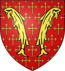 - Toutefois, Dom Calmet nous décrit plus simplement l'écu comtal du XIIIe siècle D'or à truites adossées, accompagnées de croisettes répandues.