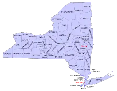 L'État de New York est divisé en 62 comtés (counties). Cinq des comtés de l'État coïncident avec les cinq arrondissements (boroughs) de la ville de New York :