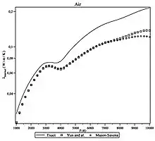La conductivité translationnelle d'un mélange gazeux de corps est solution d'un système algébrique linéaire d'ordre et de rang [4],[6]. Elle s'exprime donc sous la forme où est la fraction volumique de l'espèce dans le mélange. Il existe nombre d'approximations précises dans un domaine plus ou moins large (voir figure ci-contre). Elles sont généralement basées sur une approximation de la solution formelle sous forme d'une série de déterminants. On obtient ainsi[7] :