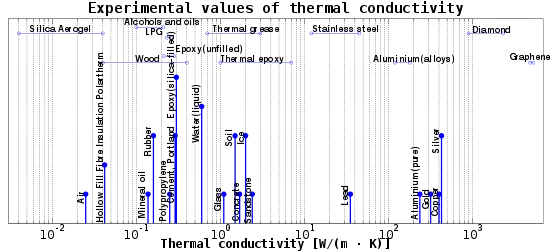 Les conductivités thermiques des substances courantes varient sur au moins quatre ordres de grandeur[17]. Les gaz ont généralement une faible conductivité thermique, tandis qu'elle est élevée pour les métaux purs. Par exemple, dans des conditions normales, la conductivité thermique du cuivre est plus de 10 000 fois supérieure à celle de l'air.