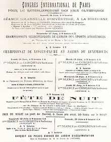 Le Congrès olympique est une réunion exceptionnelle organisée en 1894 par l'Union des sociétés françaises de sports athlétiques et depuis 1897 par le comité international olympique (CIO). Le premier, s'est tenu à Paris en 1894 à La Sorbonne ayant pour objectif initial de fixer la frontière entre amateurisme et professionnalisme (les sportsmen du monde aristocratique s'opposant à la diffusion du professionnalisme dans le sport) puis lors de la séance de clôture, le , le rétablissement des Jeux olympiques[1]. C'est également lors de ce premier congrès que fut fondé le CIO. Douze autres lui ont succédé de 1897 à 2009.