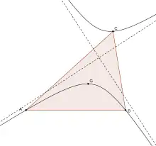 Le théorème de Brianchon-Poncelet établit qu'une hyperbole circonscrite à un triangle est équilatère si et seulement si elle passe également par l'orthocentre du triangle, et dans ce cas, son centre est sur le cercle d'Euler[4]; on parle parfois de faisceau de Poncelet en parlant de l'ensemble des hyperboles circonscrites au triangle passant par l'orthocentre[5],[6].