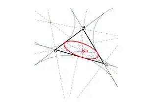L'ellipse de Mandart d'un triangle est l'unique ellipse tangente à chacun des côtés aux points de contact des cercles exinscrits (les sommets du triangle de Nagel) ; son point de Brianchon est donc le point de Nagel du triangle[7]. Elle porte le nom de H. Mandart, qui l'a étudiée dans deux articles de la fin du XIXe siècle[8],[9],[10].