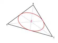 L'ellipse de Steiner d'un triangle est l'unique ellipse tangente à chacun des côtés en leur milieu. De toutes les ellipses inscrites, l'ellipse de Steiner est celle d'aire maximale.