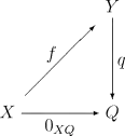 commute. De plus, le morphisme q doit être universel pour ce diagramme, c'est-à-dire que n'importe quel autre morphisme q′: Y → Q′ peut être obtenu en composant q avec un unique morphisme u : Q → Q′ :