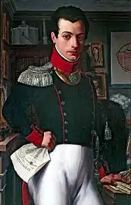 ![]() | Portrait d'un architecte en costume d'officier de la garde nationale | 1829 | huile sur toile 88 X 68 cm | Le modèle tient en main un exemplaire froissé du Moniteur universel du | Musée Carnavalet, Paris |