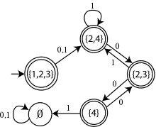 L'état initial de l’automate déterministe construit à partir de l'automate de départ est l'ensemble des états accessibles depuis 1 par des chemins formés d'ε-transitions ; c'est l'ensemble {1,2,3}. Une transition de {1,2,3} par le symbole 0 utilise soit la flèche de l'état 1 vers l'état 2, ou celle de l'état 3 vers l'état 4. Par ailleurs, ni l'état 2 ni l'état 4 sont le début d'une ε-transitions, et par conséquent δ({1,2,3},0) = {2,4}. En appliquant le même raisonnement, on construit l'automate déterministe en entier. Seuls cinq des états de l'automate déterministe sont accessibles depuis l'état initial; les onze ensembles restants de l’ensemble des parties ne sont pas accessibles.