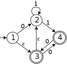 L'automate ci-contre possède quatre états : 1 est initial, 3 et 4 sont terminaux. L'alphabet est formé des symboles 0 and 1, et il a deux ε-transitions.