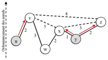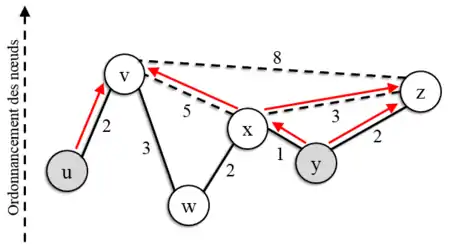 | Etape 2 : x est choisi comme second nœud à traiter pour la recherche partant de y ![]() | Etape 3 : Plus court chemin trouvé![]() |
