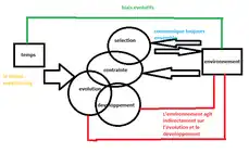 - La contrainte développementale : subit les biais et changements génétique. Cette contrainte peut s’opposer à une contrainte d’un autre type comme une contrainte de l’environnement. On assiste à un effet de pression de changements évolutifs de l’environnement sur un individu par exemple.