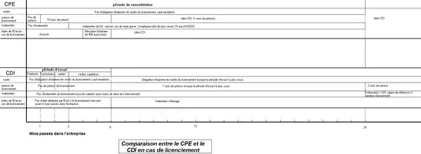 Cependant, une période d'essai en CDI varie selon la profession exercée, et n'excède généralement pas 6 mois : au-delà de 6 mois en CDI, l'employeur est, quelle que soit la profession du salarié, tenu de fournir des motifs de licenciement, tandis qu'après six mois en CPE, l'employeur pouvait toujours licencier sans donner de motif. Cela signifie que comparé à une période d'essai en CDI, le CPE était moins protecteur du salarié ; mais par rapport à un emploi en CDI où la période d'essai viendrait de se terminer, le CPE présentait des inconvénients pour le salarié (possibilité pour l'employeur de licencier sans motif, période de préavis réduite à 15 jours au lieu d'un mois si la période d'essai était inférieure à six mois).