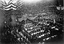 Vue de l'intérieur de l'Interstate Exposition Building (en) durant la convention. James A. Garfield est à la tribune.