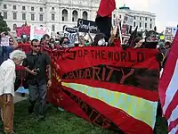 À l'extérieur du Xcel Center, quelque 2 000 à 10 000 manifestants défilaient pour protester contre la guerre en Irak et contre le président George W. Bush, provoquant des dégâts matériels et des heurts avec la police[7].