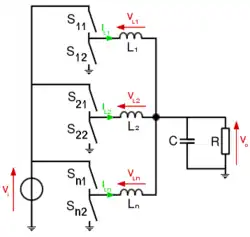 Pour une alimentation possédant n convertisseurs reliés en parallèle (voir figure 10), le courant sera réparti sur les n phases, limitant ainsi les contraintes sur chaque interrupteur et augmentant la surface d'échange thermique. En outre, la fréquence des courants et tensions vus par la charge sera n fois supérieure à celle d'un convertisseur simple, divisant d'autant l'ondulation de tension en sortie[2].