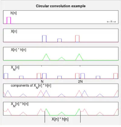 De même, pour des séquences discrètes, et un paramètre N, on peut écrire une convolution circulaire de fonctions apériodiques et comme:.