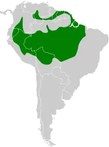 Cet oiseau se rencontre en Bolivie, au Brésil, en Colombie, en Équateur, au Guyana, en Guyane, au Pérou, au Suriname et au Venezuela[1].