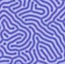 Chez le chat et les primates, la carte d'orientation contient des zones où l'orientation varie continûment et progressivement et des zones où elle varie rapidement autour de singularités. Ce sont des points où toutes les orientations de 0 à 180° sont disposées en étoile. Leur nom de pinwheel en anglais vient de ce que les secteurs colorés semblent tourner autour d'un axe comme les ailes d'un moulinet (jouet). Ces singularités sont une nécessité mathématique sur une carte possédant par ailleurs une variation continue des orientations, car la seule autre possibilité serait que la carte soit formée de lignes d'iso-orientation parallèles. Le centre des moulinets tend fortement à se trouver sur un pic de dominance oculaire[8] (donc au milieu des bandes). Si deux lignes d'orientation font un angle θ autour de la singularité, les orientations associées du champ visuel font un angle de θ/2. C'est pourquoi deux rayons opposés du moulinet correspondent à des orientations perpendiculaires (comme mauve et jaune).