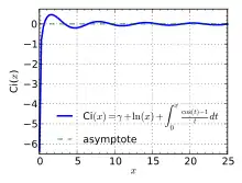 - La fonction Ci admet le développement suivant sur : où γ est la constante d'Euler-Mascheroni. Ce développement permet d'étendre la fonction Ci en une fonction analytique définie sur tout le plan complexe privé de la demi-droite des réels négatifs. La somme de la série vaut également .