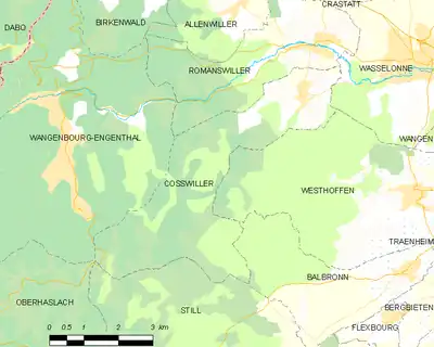 Le village de Cosswiller se situe à environ 26 km de Strasbourg.