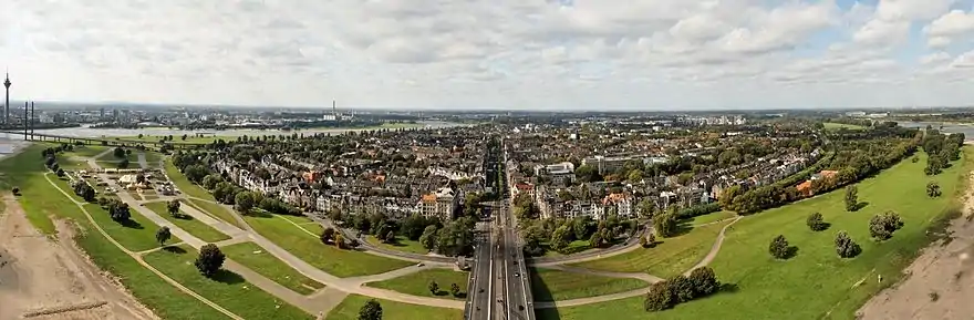 À Düsseldorf, près du port rive droite, le Rhin forme un virage pointu et donne ainsi l'impression que le quartier Oberkassel se trouve sur une presqu'île. Le coude est enjambé par le Rheinkniebrücke (de) : le « pont sur le coude du Rhin ».