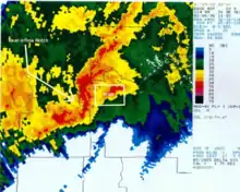 De même, dans l'image à droite, la flèche jaune montre un arc dans les réflectivités là où le jet arrive en surface derrière la ligne de grain. L'encoche de réflectivités plus faibles à l'arrière montre l'assèchement dû à la descente du jet et on retrouva le long de sa trajectoire les dégâts par rafales descendantes les plus importants.