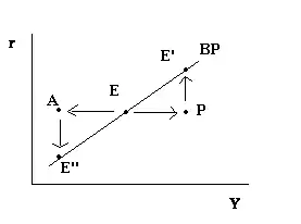 Dans le cas d’une imparfaite mobilité des capitaux, la courbe BP a une allure croissante. Pour expliquer la raison de cette allure, il est possible de faire référence au graphique latéral. Quand le revenu augmente (toutes choses égales par ailleurs), l’équilibre se déplace du point E au point P ; la balance des paiements est devenue déficitaire car les importations ont augmenté. En plus, dans le point P, elles ne sont compensées par une entrée suffisante de capitaux car le taux d'intérêt n'a, lui, pas augmenté[3].