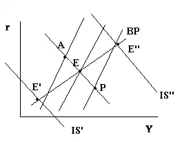 Dans le cas de baisse du taux d'intérêt, on a une sortie de capitaux. Le déficit (point P) de la balance des paiements, causé par cette sortie de capitaux, conduit à une dépréciation de la monnaie nationale. Il en résulte une amélioration de la position commerciale extérieure (déplacement de la courbe IS vers droite) et une augmentation du revenu. Le point EII est le nouveau point d’équilibre.