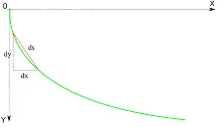 Soit l'équation cartésienne de la courbe (on exclut les courbes ayant des parties verticales), y étant dirigé vers le bas, et la courbe commençant à l'origine. On exprime un déplacement infinitésimal sur la courbe :