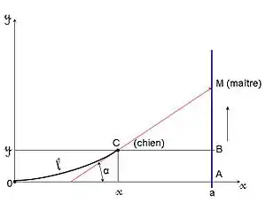 Il s’agit d’établir l'équation de la trajectoire que parcourt un chien lorsque son maître, éloigné, l'appelle tout en se déplaçant sur une droite perpendiculairement au segment de droite les séparant à l’instant origine. On conviendra qu'à cet instant, le maître est à une distance du chien ; il se déplace de façon uniforme à la vitesse . Le chien accourt à une vitesse et de façon à être, à tout moment, dirigé vers son maître. On peut donc choisir un repère orthonormé, tel que le chien soit au point O de coordonnées (0,0) et le maître au point A de coordonnées (a,0) au départ, la droite décrite par le maître étant celle d’équation . On désigne par les coordonnées du chien au bout du temps .