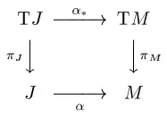 Plus généralement, on peut reformuler les résultats précédent dans le cadre des Morphisme de groupes. Notons que le fibré tangent T J de J est le fibré trivial J × R et qu'il existe une section canonique ι de ce fibré telle que ι ( t ) = 1 (ou, plus précisément, ( t, 1)) pour tout t ∈ J. La courbe α induit une application groupée α ∗ : T J → T M pour que le diagramme suivant commute: