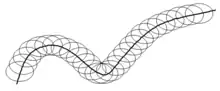 Une autre façon de généraliser est (même en 2D) de considérer une distance variable, par exemple paramétrée par une autre courbe[21]. On peut par exemple tracer (enveloppe) avec une ellipse au lieu d'un cercle[21] comme c'est possible par exemple dans Metafont.