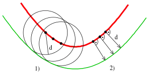 Lors de la détermination du chemin de coupe d'une pièce avec un angle aigu pour l'usinage, il faut définir la courbe parallèle (décalée) à une courbe donnée qui a une normale discontinue au niveau de l'angle. Même si la courbe donnée n'est pas lisse à l'angle aigu, sa courbe parallèle peut être lisse avec une normale continue, ou elle peut avoir des pointes lorsque la distance de la courbe correspond au rayon de courbure à l'angle aigu.