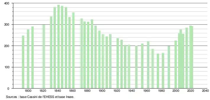 L'évolution du nombre d'habitants est connue à travers les recensements de la population effectués dans la commune depuis 1793. Pour les communes de moins de 10 000 habitants, une enquête de recensement portant sur toute la population est réalisée tous les cinq ans, les populations légales des années intermédiaires étant quant à elles estimées par interpolation ou extrapolation[27]. Pour la commune, le premier recensement exhaustif entrant dans le cadre du nouveau dispositif a été réalisé en 2004[28].
