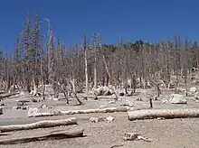 Des volcans surgissent entre 3,6 et 2,3 millions d'années BP près de la région actuelle de Long Valley[20]. Des éruptions se produisent sur et autour de Glass Mountain entre 2,1 et 0,8 million d'années BP[21]. Des cendres volcaniques issues de la gigantesque éruption de la caldeira de Long Valley, environ 760 000 ans BP, sont conservées à l'intérieur de l'épais tuf de Bishop qui recouvre l'essentiel de la région.