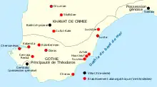 Par ailleurs, la majeure partie du territoire gothique devient ce qu'il convient d'appeler la principauté de Théodoros, fondée dans les années 1360[17]. Héritier de la culture gréco-byzantine présente dans la région depuis plusieurs siècles, il subsiste jusqu'en 1475, indépendant des Génois mais aussi des Mongols, de la Horde d'Or, puis du khanat de Crimée. Cette principauté de Théodoros recouvre globalement le littoral sud de la péninsule. Les souverains de ce territoire sont aussi qualifiés de « princes de Gothie » et pourraient descendre d'un toparque byzantin[42]. À partir de 1447, après avoir soutenu la république de Venise contre Gênes, le destin de cette principauté s'assombrit. Avec les chutes de l'Empire byzantin proprement dit en 1453 puis de l'Empire de Trébizonde en 1461, la principauté de Théodoros est parfois connue comme le dernier réduit byzantin indépendant. De plus en plus menacée par les visées de l'Empire ottoman sur la région, elle finit par en accepter la suzeraineté en 1474, première étape vers sa disparition, effective dès 1475 avec sa conquête par les Turcs. Dans l'ensemble, la nature exacte de la principauté de Théodoros est disputée. Parfois considéré comme le dernier État grec à résister à la progression ottomane, il a aussi été qualifié de dernier État des Goths et des sources font de certains de ses souverains des individus d'origine circassienne[43]. De plus, l'usage de la langue grecque y très bien attestée, de même que la liturgie byzantine.