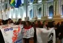 Les manifestations à Sucre sont devenues violentes, et la violence est montée jusqu'à ce qu'un incendie éclate dans un local de campagne du MAS et des bureaux de la Fédération unique de travailleurs des peuples originaires de Chuquisaca (Federación Única de Trabajadores de los Pueblos Originarios de Chuquisaca - Futpoch) ont été attaqués[45]. Plus tard, des femmes policières, membres de l'Association Nationale des Sous-officiers, Sergents, Capitaines et Policiers (Asociación Nacional de Suboficiales, Sargentos, Cabos y Policía - Anssclapol) ont manifesté sur la Plaza 25 de Mayo pour demander le retour du calme. La leader de la manifestation, la sergente Cecilia Calani, qui portait un mouchoir blanc, exigeait que le président respecte les élections[46].